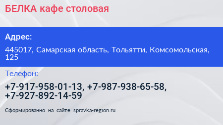 БЕЛКА, кафе-столовая по адресу 445017, Самарская область, Тольятти, Комсомольская, 125 в дальнейшем Организация, размещена в следующих категориях: