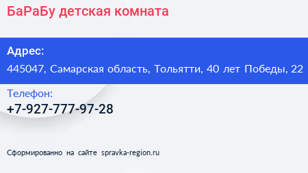 БаРаБу, детская комната по адресу 445047, Самарская область, Тольятти, 40 лет Победы, 22 в дальнейшем Организация, размещена в следующих категориях: