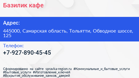 Базилик, кафе по адресу 445000, Самарская область, Тольятти, Обводное шоссе, 125 в дальнейшем Организация, размещена в следующих категориях: