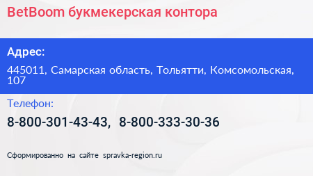 BetBoom, букмекерская контора по адресу 445011, Самарская область, Тольятти, Комсомольская, 107 в дальнейшем Организация, размещена в следующих категориях: