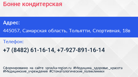 Бонне, кондитерская по адресу 445057, Самарская область, Тольятти, Спортивная, 18в в дальнейшем Организация, размещена в следующих категориях: