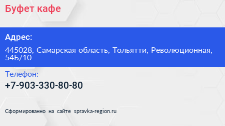 Буфет, кафе по адресу 445028, Самарская область, Тольятти, Революционная, 54Б/10 в дальнейшем Организация, размещена в следующих категориях: