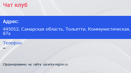 Чат-клуб по адресу 445012, Самарская область, Тольятти, Коммунистическая, 87а в дальнейшем Организация, размещена в следующих категориях: