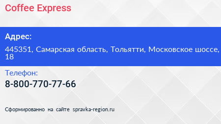 Coffee Express по адресу 445351, Самарская область, Тольятти, Московское шоссе, 18 в дальнейшем Организация, размещена в следующих категориях: