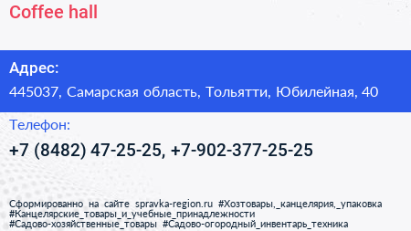 Coffee hall по адресу 445037, Самарская область, Тольятти, Юбилейная, 40 в дальнейшем Организация, размещена в следующих категориях: