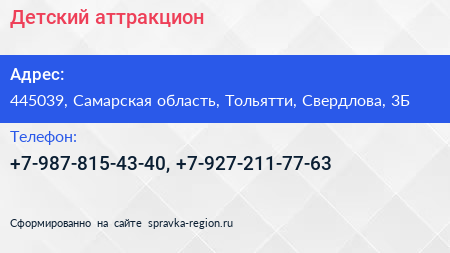 Детский аттракцион по адресу 445039, Самарская область, Тольятти, Свердлова, 3Б в дальнейшем Организация, размещена в следующих категориях: