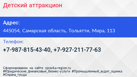 Детский аттракцион по адресу 445054, Самарская область, Тольятти, Мира, 113 в дальнейшем Организация, размещена в следующих категориях: