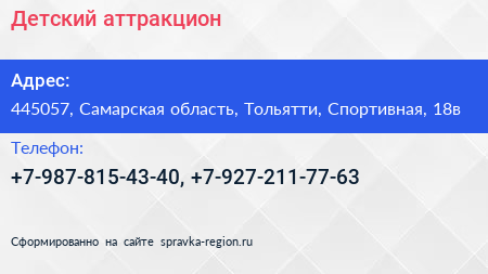 Детский аттракцион по адресу 445057, Самарская область, Тольятти, Спортивная, 18в в дальнейшем Организация, размещена в следующих категориях: