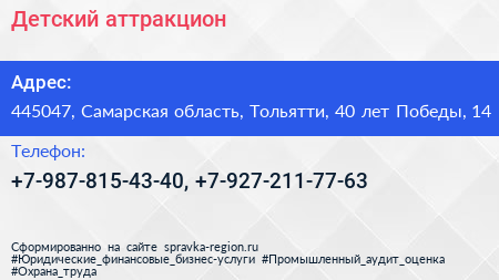 Детский аттракцион по адресу 445047, Самарская область, Тольятти, 40 лет Победы, 14 в дальнейшем Организация, размещена в следующих категориях: