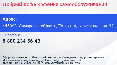Добрый кофе, кофейня самообслуживания по адресу 445043, Самарская область, Тольятти, Коммунальная, 32 в дальнейшем Организация, размещена в следующих категориях: