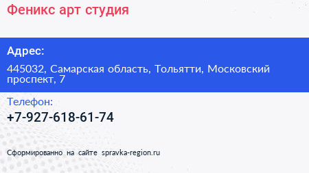 Феникс, арт-студия по адресу 445032, Самарская область, Тольятти, Московский проспект, 7 в дальнейшем Организация, размещена в следующих категориях:
