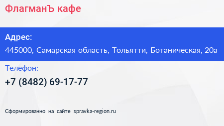 ФлагманЪ, кафе по адресу 445000, Самарская область, Тольятти, Ботаническая, 20а в дальнейшем Организация, размещена в следующих категориях: