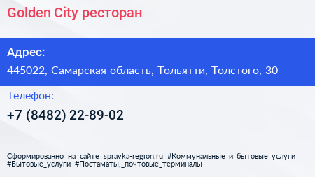 Golden City, ресторан по адресу 445022, Самарская область, Тольятти, Толстого, 30 в дальнейшем Организация, размещена в следующих категориях: