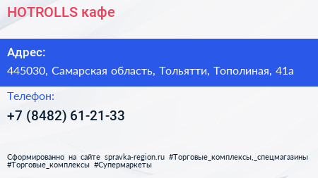 HOTROLLS, кафе по адресу 445030, Самарская область, Тольятти, Тополиная, 41а в дальнейшем Организация, размещена в следующих категориях: