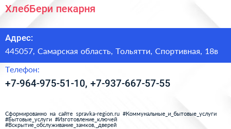 ХлебБери, пекарня по адресу 445057, Самарская область, Тольятти, Спортивная, 18в в дальнейшем Организация, размещена в следующих категориях: