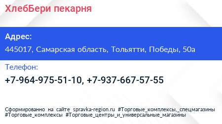 ХлебБери, пекарня по адресу 445017, Самарская область, Тольятти, Победы, 50а в дальнейшем Организация, размещена в следующих категориях: