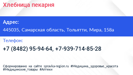 Хлебница, пекарня по адресу 445035, Самарская область, Тольятти, Мира, 158а в дальнейшем Организация, размещена в следующих категориях: