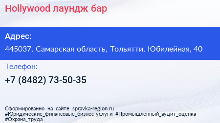 Hollywood, лаундж-бар по адресу 445037, Самарская область, Тольятти, Юбилейная, 40 в дальнейшем Организация, размещена в следующих категориях: