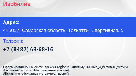 Изобилие по адресу 445057, Самарская область, Тольятти, Спортивная, 6 в дальнейшем Организация, размещена в следующих категориях: