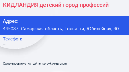 КИДЛАНДИЯ, детский город профессий по адресу 445037, Самарская область, Тольятти, Юбилейная, 40 в дальнейшем Организация, размещена в следующих категориях: