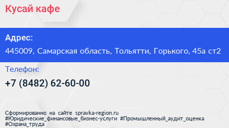 Кусай, кафе по адресу 445009, Самарская область, Тольятти, Горького, 45а ст2 в дальнейшем Организация, размещена в следующих категориях: