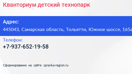 Кванториум, детский технопарк по адресу 445043, Самарская область, Тольятти, Южное шоссе, 165а в дальнейшем Организация, размещена в следующих категориях:
