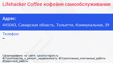 Lifehacker Coffee, кофейня самообслуживания по адресу 445043, Самарская область, Тольятти, Коммунальная, 39 в дальнейшем Организация, размещена в следующих категориях: