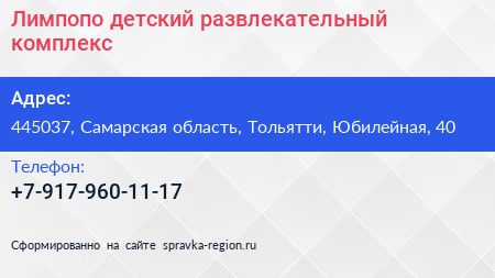 Лимпопо, детский развлекательный комплекс по адресу 445037, Самарская область, Тольятти, Юбилейная, 40 в дальнейшем Организация, размещена в следующих категориях: