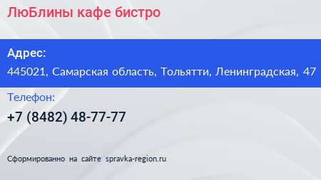 ЛюБлины, кафе-бистро по адресу 445021, Самарская область, Тольятти, Ленинградская, 47 в дальнейшем Организация, размещена в следующих категориях: