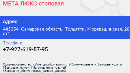 МЕТА-ЛЮКС, столовая по адресу 445354, Самарская область, Тольятти, Морквашинская, 28 ст1 в дальнейшем Организация, размещена в следующих категориях: