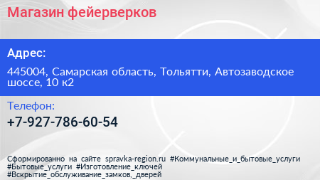 Магазин фейерверков по адресу 445004, Самарская область, Тольятти, Автозаводское шоссе, 10 к2 в дальнейшем Организация, размещена в следующих категориях: