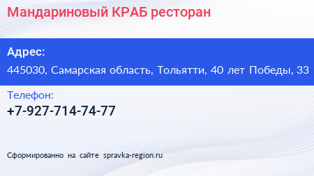Мандариновый КРАБ, ресторан по адресу 445030, Самарская область, Тольятти, 40 лет Победы, 33 в дальнейшем Организация, размещена в следующих категориях: