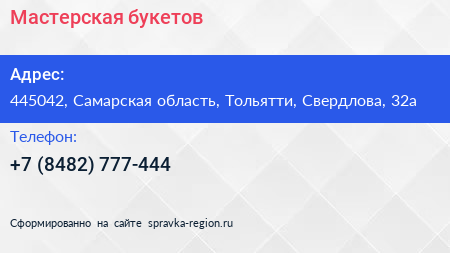 Мастерская букетов по адресу 445042, Самарская область, Тольятти, Свердлова, 32а в дальнейшем Организация, размещена в следующих категориях: