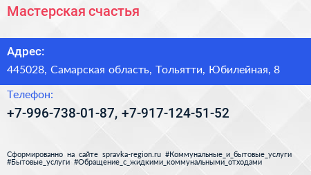Мастерская счастья по адресу 445028, Самарская область, Тольятти, Юбилейная, 8 в дальнейшем Организация, размещена в следующих категориях: