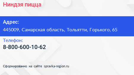 Ниндзя-пицца по адресу 445009, Самарская область, Тольятти, Горького, 65 в дальнейшем Организация, размещена в следующих категориях:
