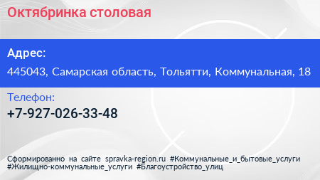Октябринка, столовая по адресу 445043, Самарская область, Тольятти, Коммунальная, 18 в дальнейшем Организация, размещена в следующих категориях: