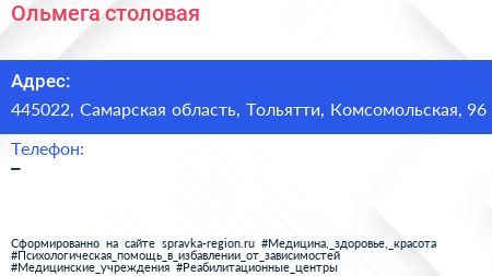 Ольмега, столовая по адресу 445022, Самарская область, Тольятти, Комсомольская, 96 в дальнейшем Организация, размещена в следующих категориях: