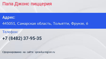 Папа Джонс, пиццерия по адресу 445051, Самарская область, Тольятти, Фрунзе, 6 в дальнейшем Организация, размещена в следующих категориях: