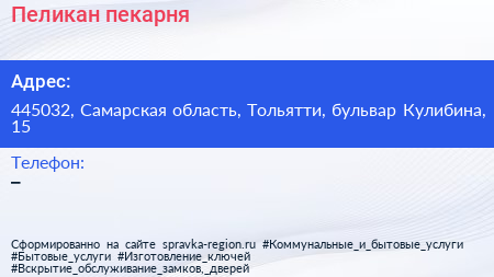 Пеликан, пекарня по адресу 445032, Самарская область, Тольятти, бульвар Кулибина, 15 в дальнейшем Организация, размещена в следующих категориях: