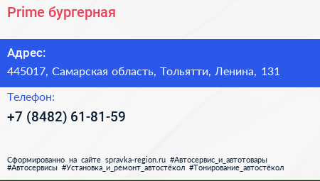 Prime, бургерная по адресу 445017, Самарская область, Тольятти, Ленина, 131 в дальнейшем Организация, размещена в следующих категориях: