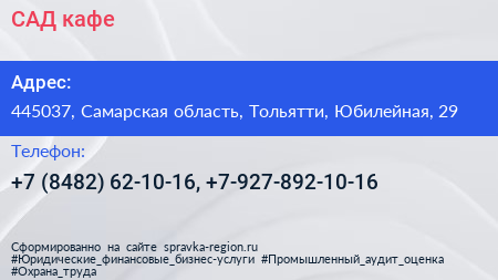 САД, кафе по адресу 445037, Самарская область, Тольятти, Юбилейная, 29 в дальнейшем Организация, размещена в следующих категориях: