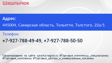 Шашлычок по адресу 445004, Самарская область, Тольятти, Толстого, 22а/1 в дальнейшем Организация, размещена в следующих категориях: