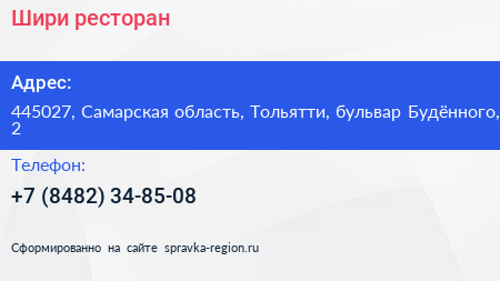 Шири, ресторан по адресу 445027, Самарская область, Тольятти, бульвар Будённого, 2 в дальнейшем Организация, размещена в следующих категориях: