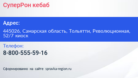 СуперРон кебаб по адресу 445026, Самарская область, Тольятти, Революционная, 52/7 киоск в дальнейшем Организация, размещена в следующих категориях: