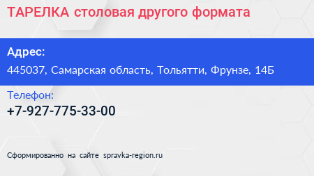 ТАРЕЛКА, столовая другого формата по адресу 445037, Самарская область, Тольятти, Фрунзе, 14Б в дальнейшем Организация, размещена в следующих категориях: