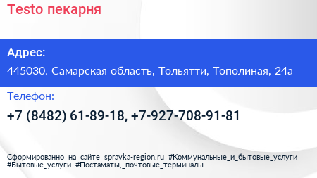 Testo, пекарня по адресу 445030, Самарская область, Тольятти, Тополиная, 24а в дальнейшем Организация, размещена в следующих категориях: