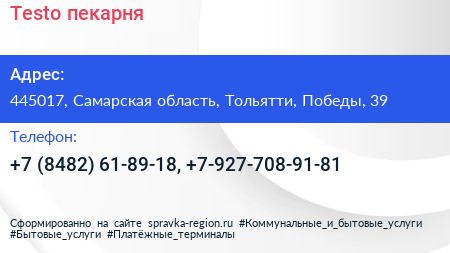 Testo, пекарня по адресу 445017, Самарская область, Тольятти, Победы, 39 в дальнейшем Организация, размещена в следующих категориях: