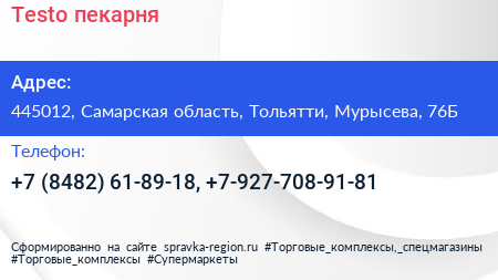 Testo, пекарня по адресу 445012, Самарская область, Тольятти, Мурысева, 76Б в дальнейшем Организация, размещена в следующих категориях: