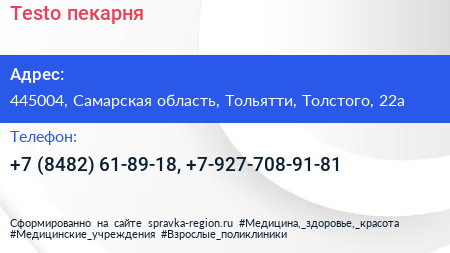 Testo, пекарня по адресу 445004, Самарская область, Тольятти, Толстого, 22а в дальнейшем Организация, размещена в следующих категориях: