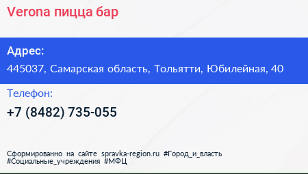 Verona, пицца-бар по адресу 445037, Самарская область, Тольятти, Юбилейная, 40 в дальнейшем Организация, размещена в следующих категориях: